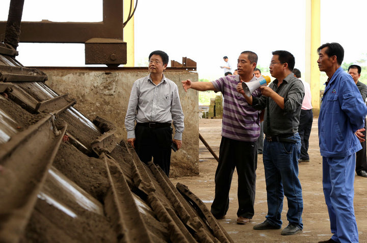 考察期间,黄国强一行与昌菱制糖公司座谈,听取了公司制糖产业发展、循环经济发展以及长兴生物有机肥项目发展情况,双方相互交流糖料蔗发展的经验和措施,特别是在生物有机肥的推广和使用等问题上做了深入的研究交流。随后,黄国强一行深入到长兴生物肥厂以及使用生物有机肥的甘蔗基地考察,对长兴生物有机肥发挥的肥效给予了充分的肯定。图为广东湛江农垦局副局长黄国强(左二)一行参观长兴生物肥厂(黄琼震)