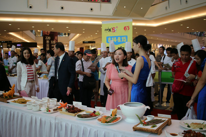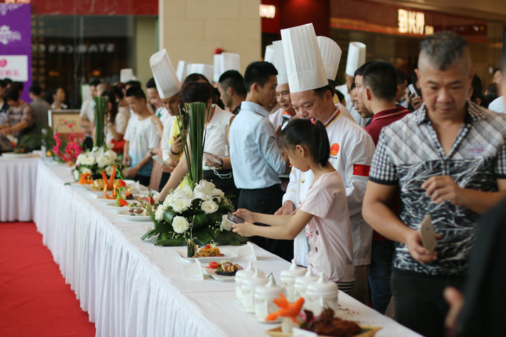 比赛当场,在牛扒大师表演赛环节,来自广西各大五星级酒店的酒店大厨和来自美国、法国的西餐大厨一展身手,现场精心烹饪牛扒,仅一会功夫,整个比赛现场都弥漫着牛扒的香味。此外,在国际美食创新大赛环节,参赛选手们分别按照指定食材、自选食材环节的要求创作菜品,各种普通的食材在参赛选手们手中不断被烹饪出各种美味的菜肴。其中,由万象城四海一家餐厅制作的“牛气冲天”特色全牛宴,震撼全场。中外名厨大师联袂表演,国际美食的魅力吸引了现场观众外三层里三层,连4楼5楼都被围观的人群占据,场面热烈,人山人海,人气爆棚。